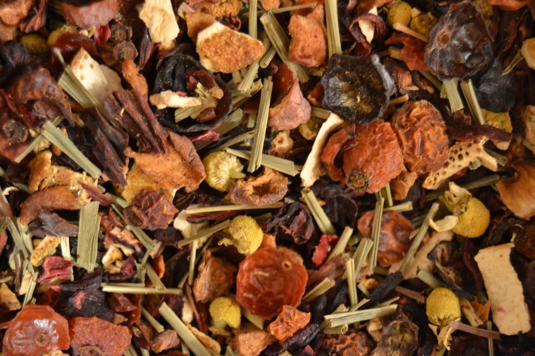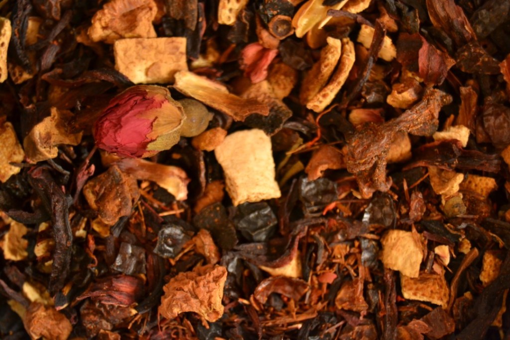 Karkadè, rosa canina, zucchero rock, aromi, mela, arancio in scorze, cannella, choiodo di garofano, mandorla e gelsomino. Gusto speziato e corposo.