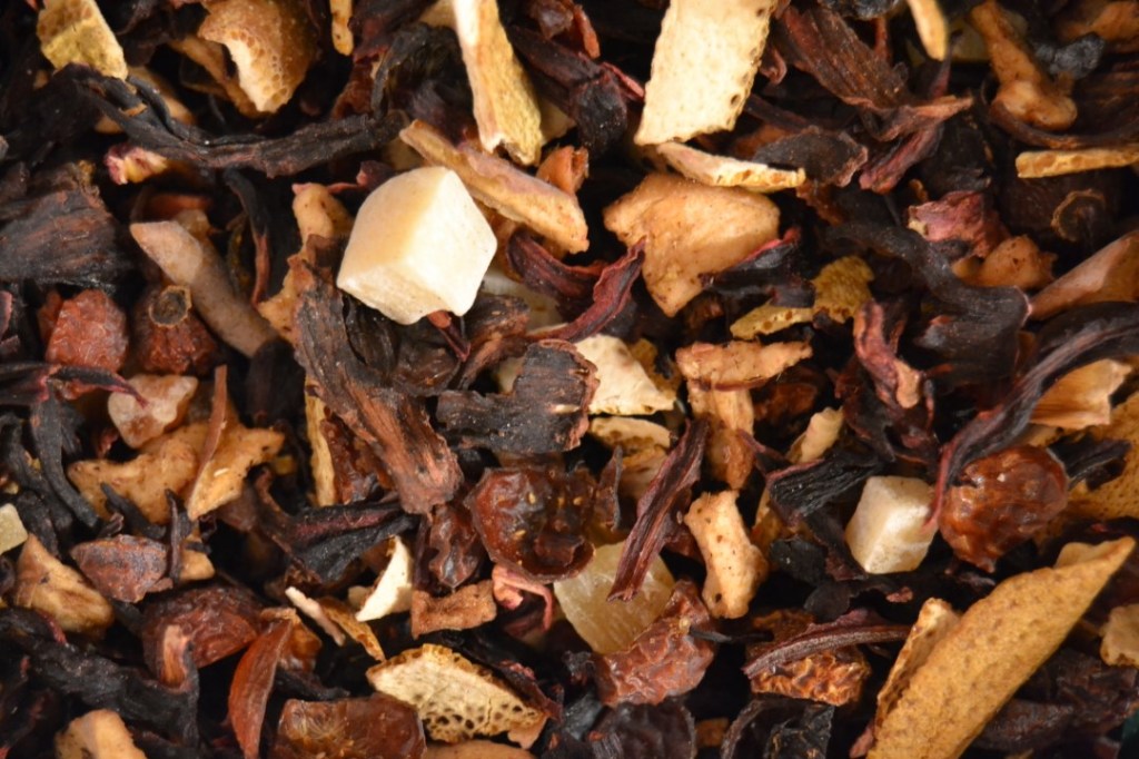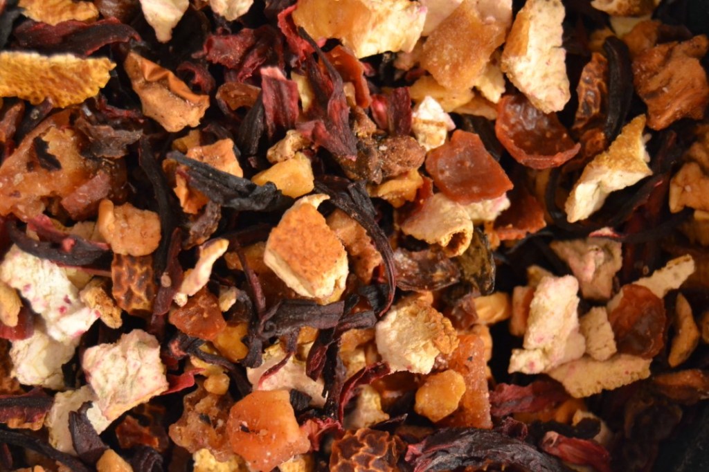 Karkadè, scorza d’arancio, rosa canina, aromi, cannella e calendula.