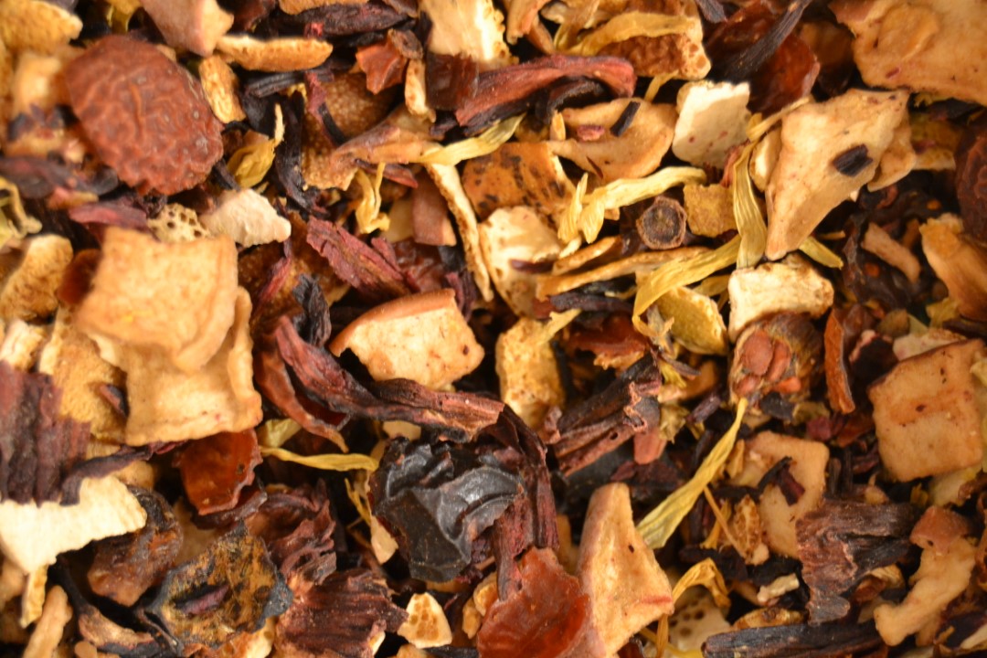 Infuso a base di rosa canina, karkadè, scorza d’agrumi, fiori, spezie, mela e pesca in pezzi, calendula e aromi. Completamente privo di caffeina, con effetti diuretici e digestivi, dissetante in estate e corroboranti in inverno.