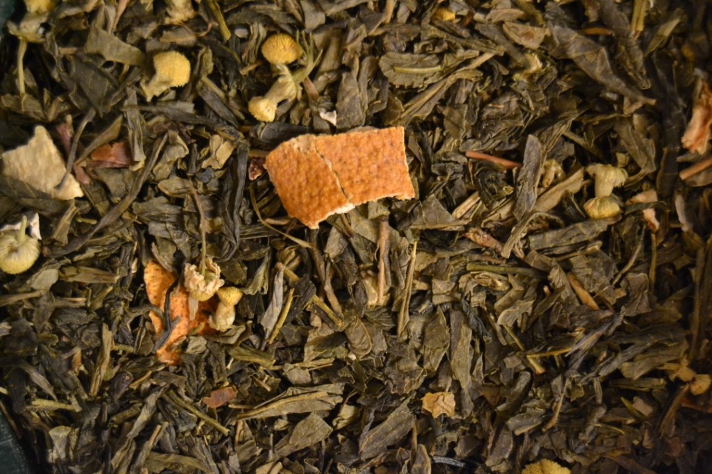 Tè verde giapponese, scorze d’agrumi, camomilla in fiore, aromi.